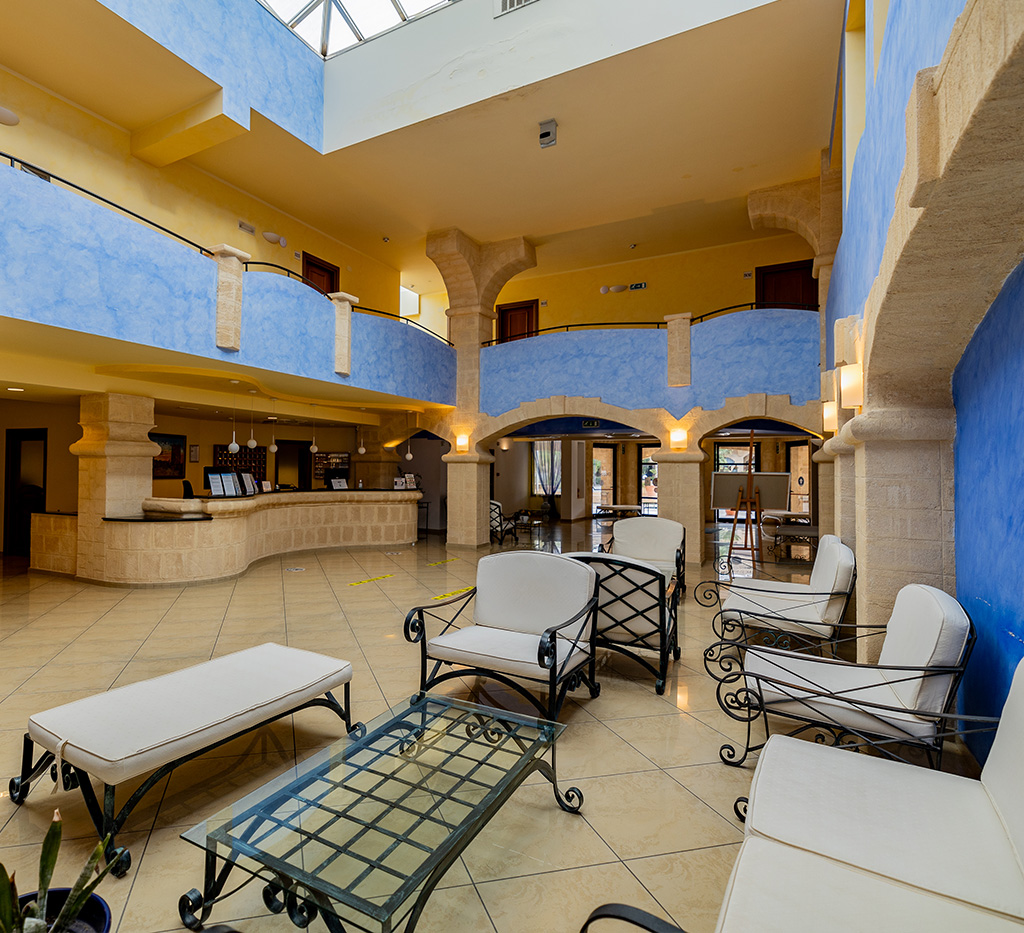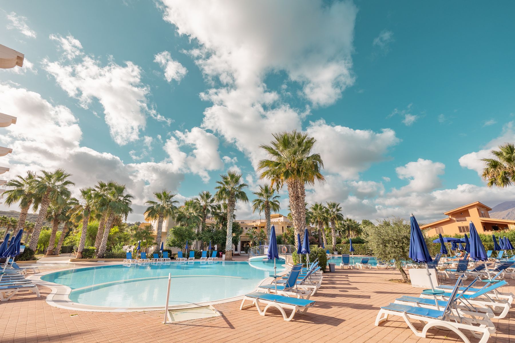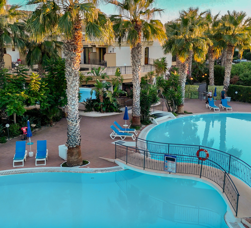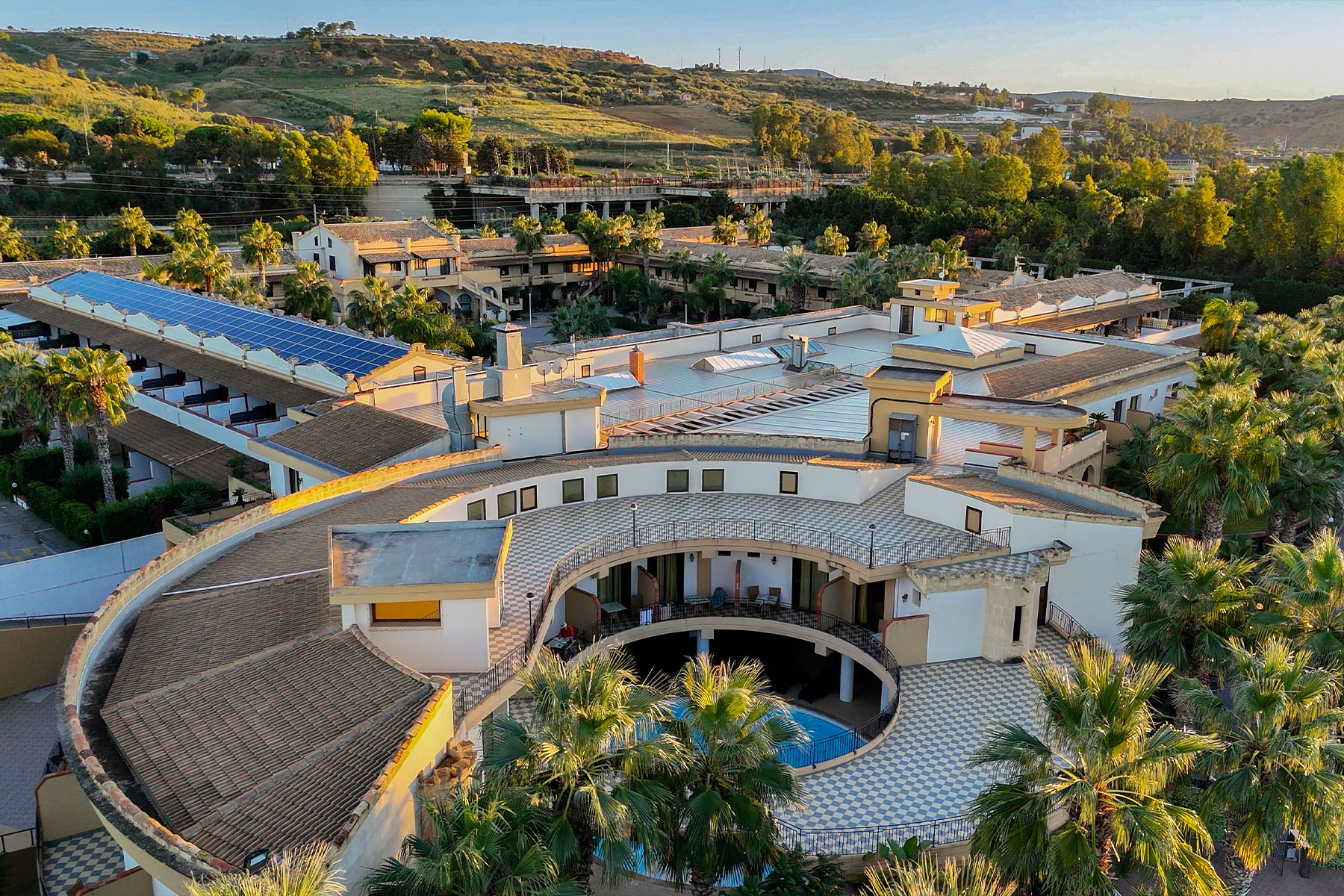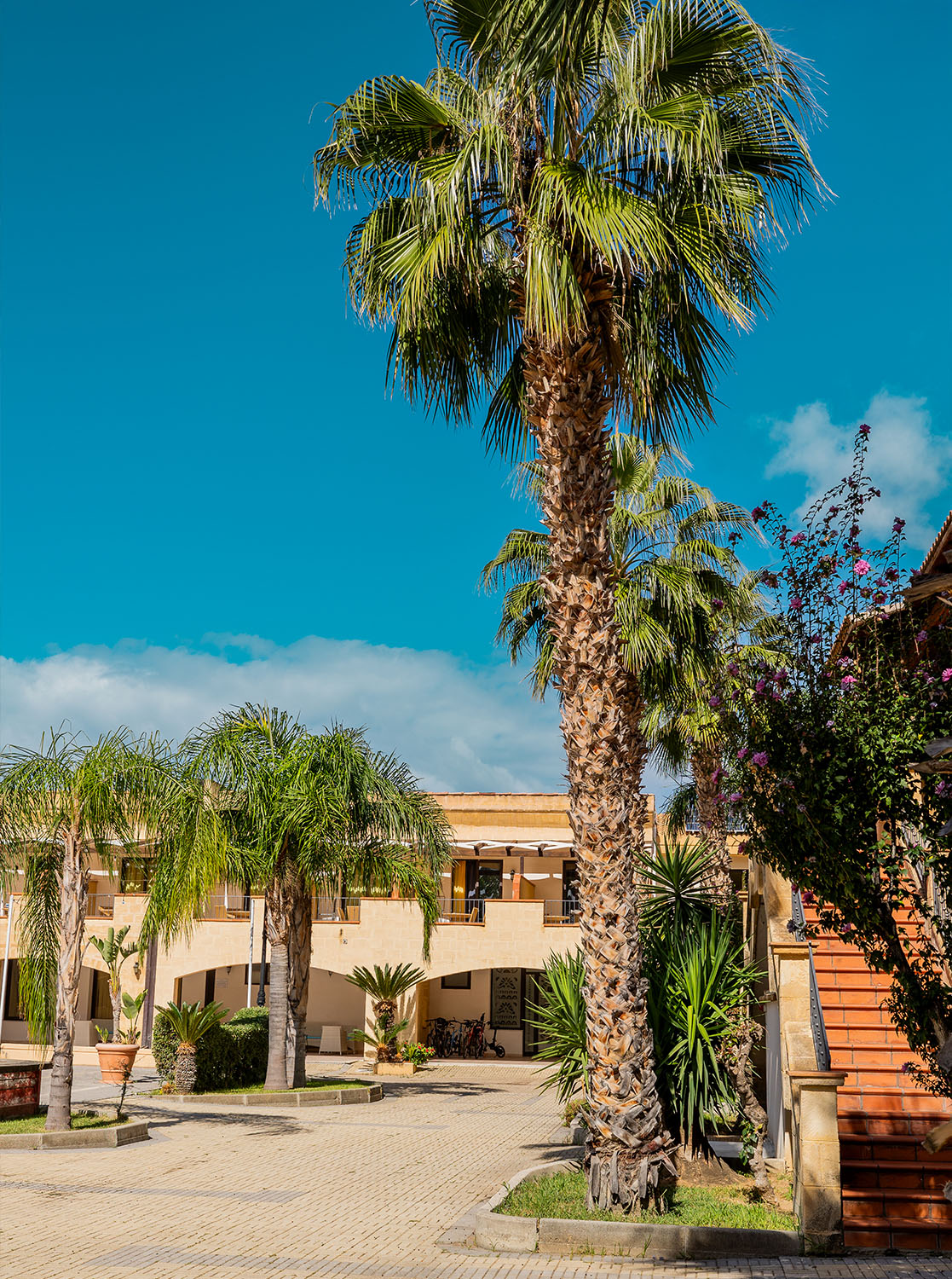 L’architettura esterna dell’Hotel prende ispirazione dai colori e dall’atmosfera della costa siciliana. Gli ampi spazi all’aperto si articolano intorno alle due piscine, le quali offrono un’ambientazione particolarmente suggestiva per eventi eleganti. Il richiamo all’atmosfera pittoresca degli antichi borghi siciliani si sposa perfettamente alla modernità delle attrezzature presenti e alla raffinatezza dei servizi.